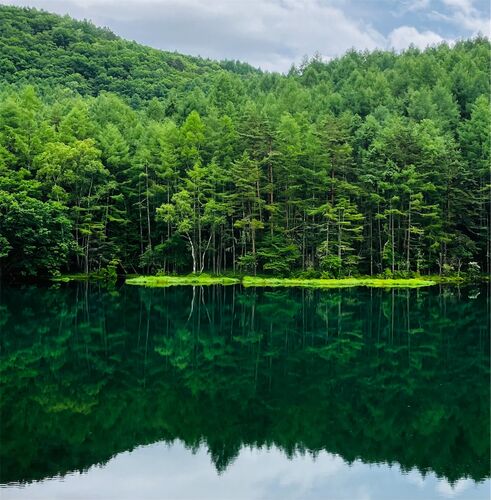 今回の旅行では、ここを訪れることを一番に考えていた場所です。 御射鹿池(みしゃかいけ) 標高約1500mにある池です。 東山魁夷の絵「緑響く」のモチーフになったとも言われていて、一度訪れてみたかったところです。 水鳥が遊んでいました。